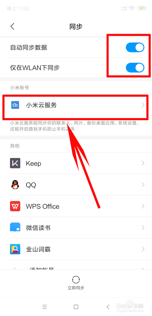点击开同步之后,可以看到本身手机设置的是否主动同步和什么时辰同步(建议设置为在WLAN下能主动同步)。这里我们点击下面的小米云办事