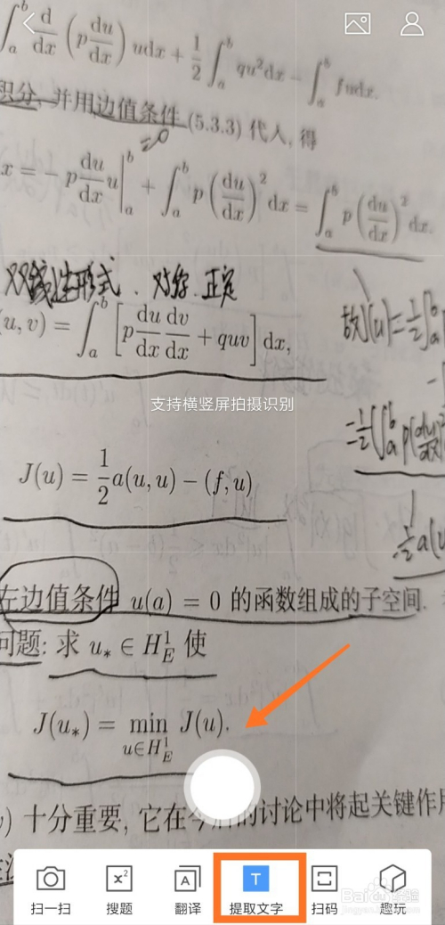 提取文字功能:点击第四项“提取文字”,可以拍摄一张图片,瞄准图片后,点击箭头处即可拍摄。