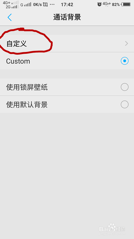 进入通话布景的界面之后,我们点击最上侧的自界说,这样我们想要什么图片就设置什么图片。
