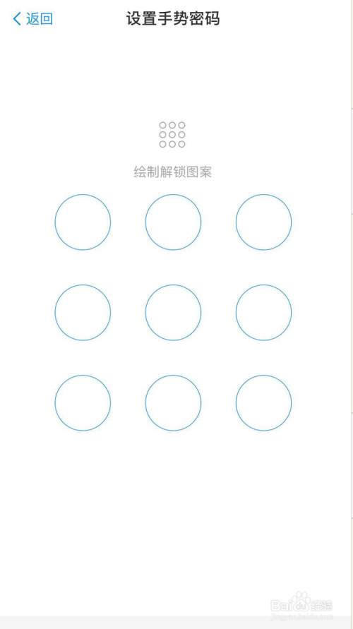 标的目的右滑动滑块后,进入设置手势密码本家儿页。在手势密码键盘上滑脱手指设置一个手势密码,然后再反复一遍设置的密码进行确认(一共两遍),确认后密码设置当作功!