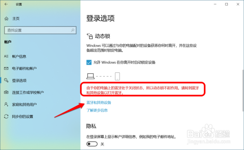 此时鄙人面会显示:因为你的电脑上的蓝牙处于封闭状况,所以动态锁不起感化。请转到蓝牙和其他设备以打开蓝牙。我们点击:蓝牙和其他设备;