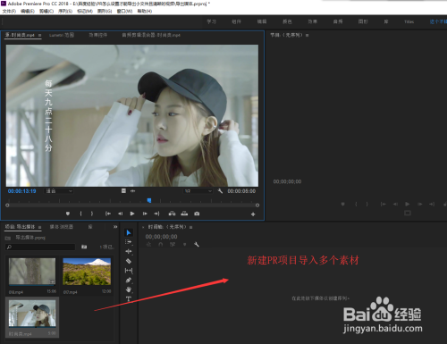 打开Premiere软件,新建项目,然后导入多个需要剪辑的素材到新建的PR项目中。