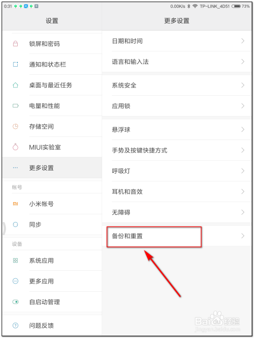 右侧呈现更多设置,找到“备份和重置”并点击