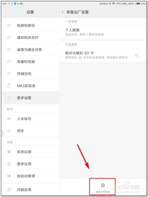 完当作后,点击下面“重置平板电脑”即可恢复出厂设置