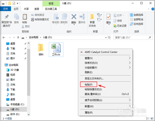 进入U盘,在空白处鼠标右击,呈现窗口,点击【粘贴】。