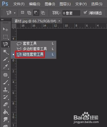 第二步:在左侧东西栏中选择“磁性套索东西”,圈选住需要改变颜色的服饰区域。