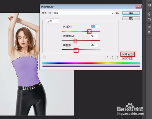 第五步:勾选上“着色”,调整色相、饱和度、明度的滑块,酿成想要的颜色后,单击“确定”按钮。