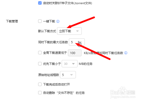 然后【下载办理】中选中【默认下载体例为当即下载】,然后【同时下载的最大使命数最好不跨越5】