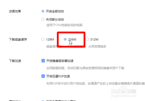 接着在【下载磁盘缓存】中勾选【256M】,这里要注重,磁盘缓存越大,占用内存越大,占用资本越多