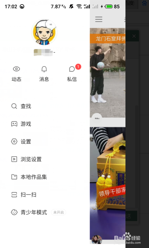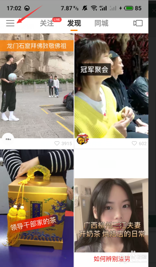 打开快手,进入“发现"页面,找到页面左上角的三个横杠标记。