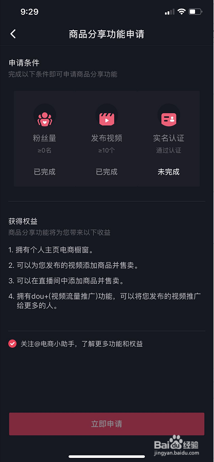 告竣三个前提:粉丝数目大于0,发布10个以上的视频,经由过程实名认证。就可以点击“当即申请”,开通橱窗功能了。