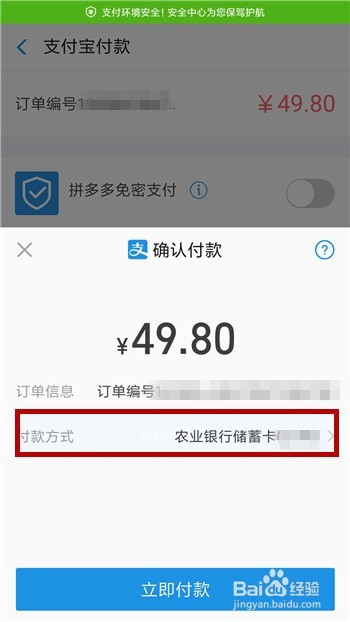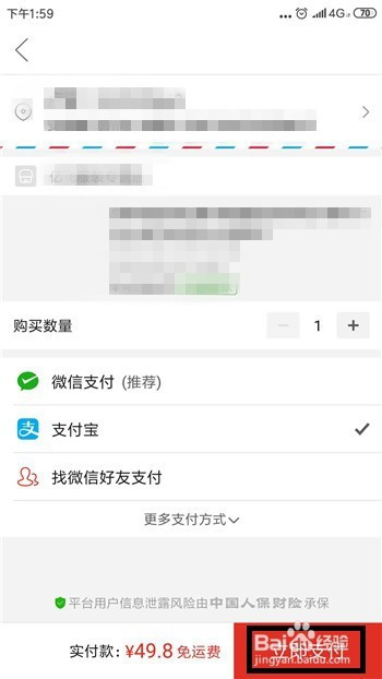 接下来就是订单确认界面了,选择好收货地址后选择支付体例为【支付宝】后点击【当即支付】。