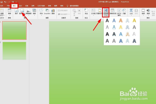 我们首先来插入艺术字:打开PPT,点击【插入】选项卡,在【文本】选项组中找到【艺术字】。