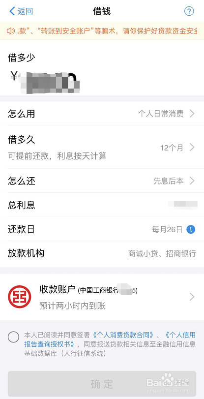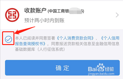 告贷信息填写完当作今后,勾选赞成签订《小我消费贷条目合同》、《小我信用陈述查询授权书》,贷条目信息会上报人行小我征信系统,最后点击确定。