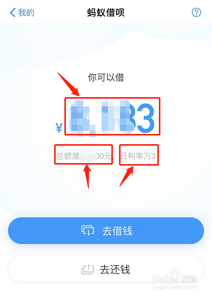 进入蚂蚁借呗今后,可以看到你当前可以告贷的额度、总额度、以及日利率;