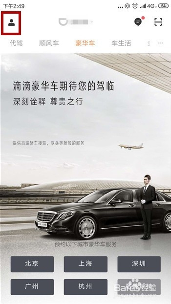 打开手机里的滴滴出行,在首页里点击左上角的账号头像。