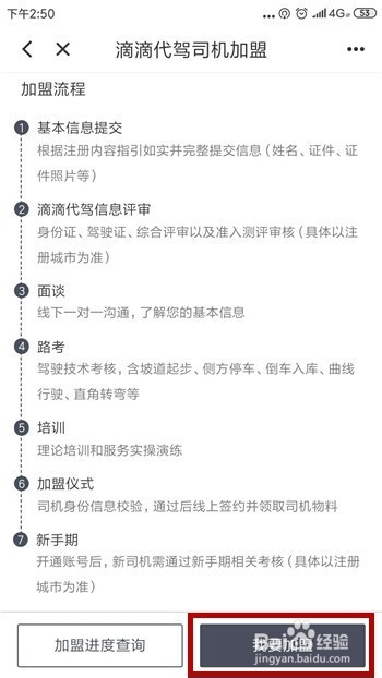 然后在代驾司机界面中会有申请的前提以及具体的流程,领会后点击【我要加盟】。