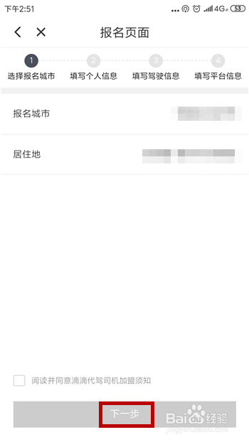 这样就会进入报名界面,上方是四个具体的流程,选择赞成和谈后点击【下一步】。