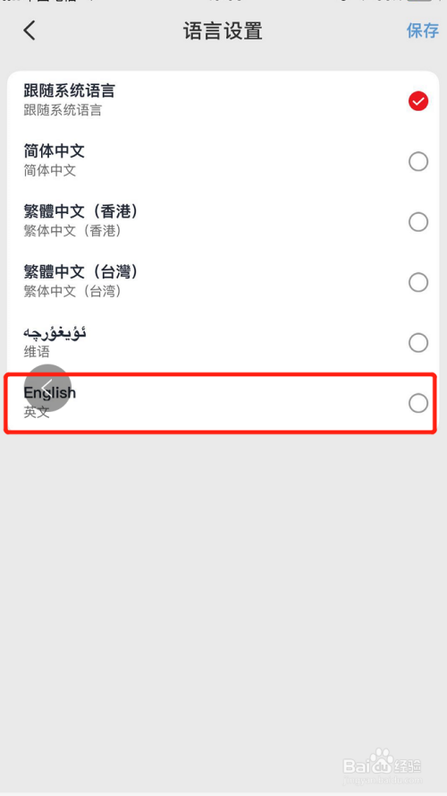 点击去后来到说话设置本家儿页,系统默认的说话设置是【跟从系统说话】,我们要设置当作英文,就要找到【English】一栏,点击它!