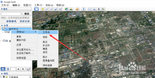 首先,我们打开电脑上已经安装的GOOGLE EARTH,注重必然要联网状况,不然无法进行下一步操作。打开后左侧显示导航栏,鼠标右键点击我的地址,依次选择添加>>>文件夹。