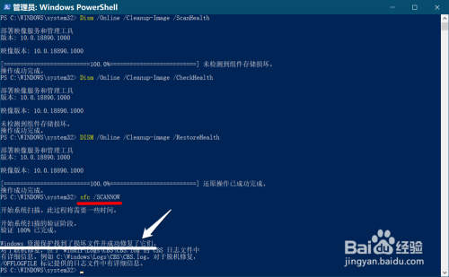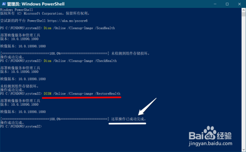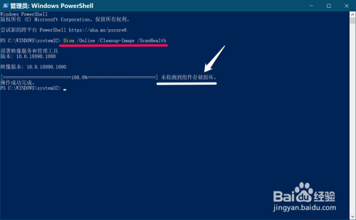 在 Windows PowerShell(办理员)窗口中,输入(可复制 - 粘贴):Dism /Online /Cleanup-Image /ScanHealth号令,按下键盘上的回车键,运行完当作后显示:
