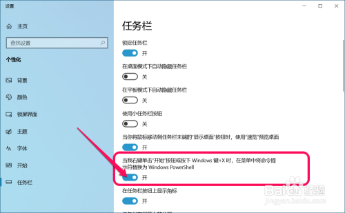 右键点击使命栏空白处 - 使命栏设置,点击:当我右键单击【起头】按纽或按下Windows 键 +X 时,在菜单中将号令提醒符替代为Windows PowerShell 的【开关】,使之处于【开】的位置;