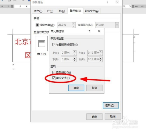 在“单位格”选项对话框中勾选“顺应文字”功能选项后,单击“确定”