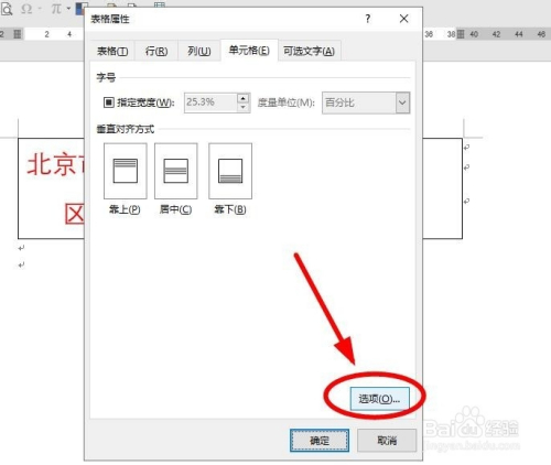 在“表格属性”对话框中,选择“单位格”选项卡中的“选项”单击