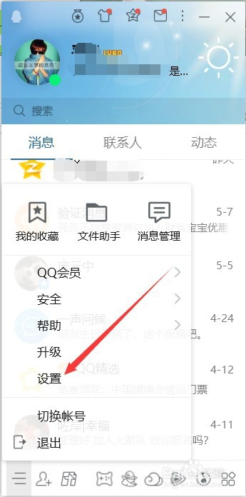 点击按钮之后,会弹出一个菜单,选择此中的“设置”按钮,可以进入电脑qq的系统设置,如图所示。