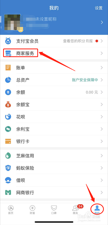 打开手机支付宝,在“我的”页面,选择“商家办事”;