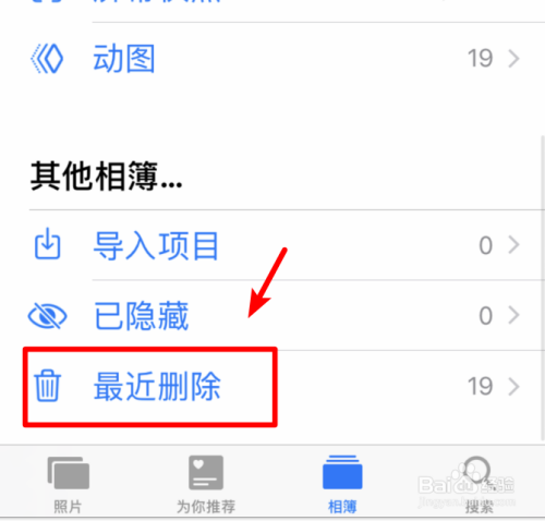进入照片列表后,在相簿内下滑到底部,选择比来删除的选项。