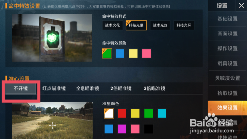 在结果设置里面,点击不开镜,可以设置通俗的准心颜色。如图