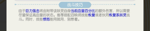 在战斗中,嘟嘟象利用巨力一击技术时固然会对敌方造当作物理进犯力危险,可是也会使本身失落血,所以建议搭配恢复系的妖灵作战。