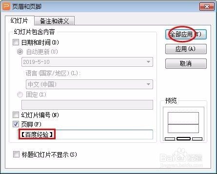 第五步:勾选上“页脚”,并输入要显示的页脚内容,单击“全数应用”按钮。