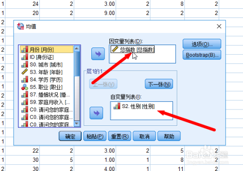 然后按照要分组并求评价数的变量放入变量表中,例如操纵性别来分组求总指数的平均数