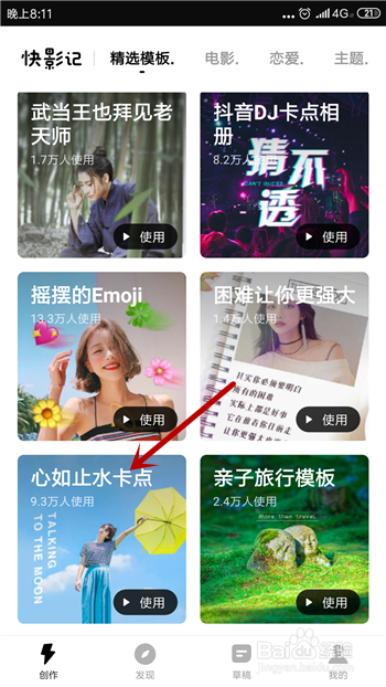 然后在快剪辑首页里下拉找到模板【心如止水滴卡】,点击打开这个模板。