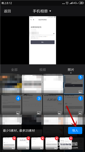 接下里会进入到我们手机相册界面,选摘要建造视频的照片,起码要5张。