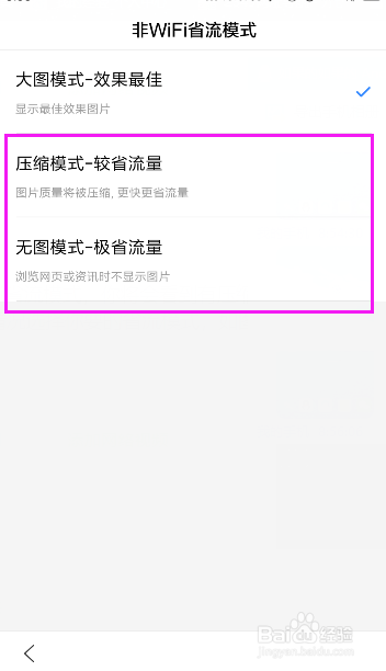 点击进入非Wifi省流模式,你将会看到有压缩模式_较省流量,无图模式_极省流量,按照你的环境选择你要的省流模式,如图所示