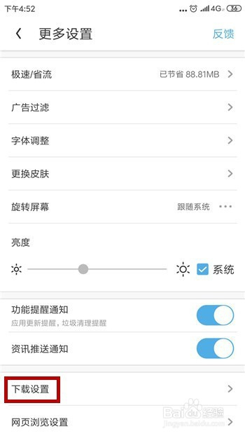 返回到下载设置界面后可看到【默认下载目次】已经设置当作功。