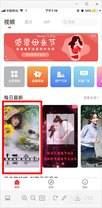 打开趣推,点击“每日最新”里面的“水牛村落融图”模板,如图。