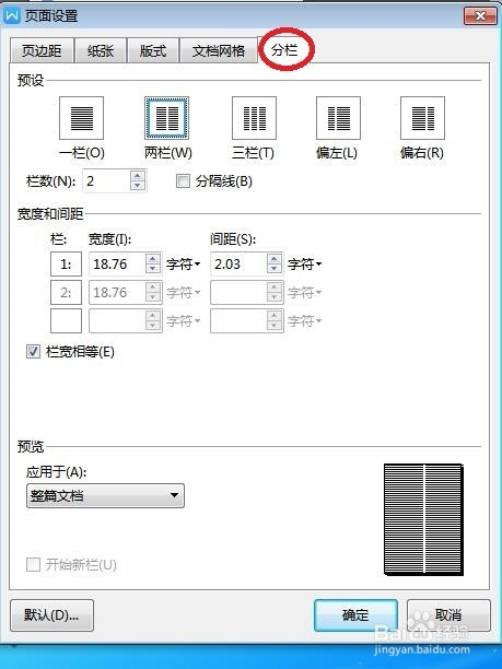 这时弹出的【页面设置】窗口,可以别离点击窗口上下各个按钮,对【页边距】、【纸张】、【板式】、【文档网格】、【分栏】,按要求进行设置。