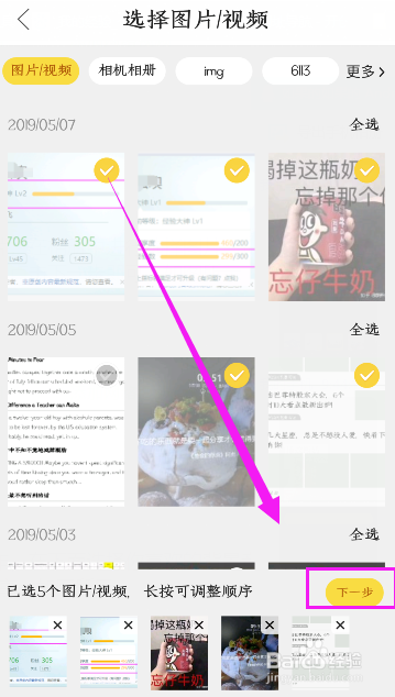 来到手机中图片,在相册中进行选择图片,你将会看到更多的图片,选择你喜好的图片,然后,点击下一步即可,如图所示