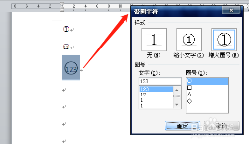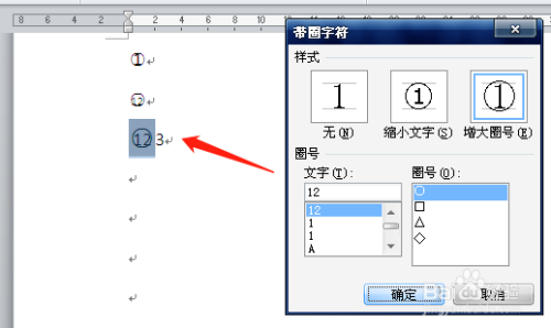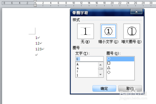 在“带圈字符”对话框中,选择合适的“样式”和“圈号”。样式有“缩小文字”和“增大圈号”二种,圈号有圆形、正方形、三角形和菱形四种。选择好后单击【确定】,带圈字符就设置好了。