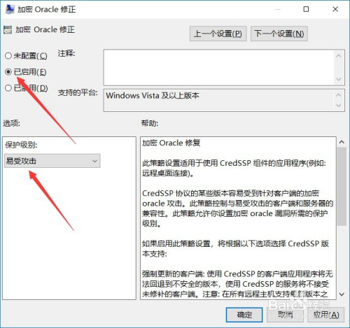 然后将加密 Oracle 批改设置为“已启用”,庇护级别设置为“易受进犯”,如图所示。