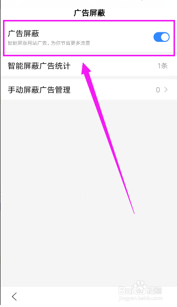 来到告白屏障页面,将下面的告白屏障后面的开关打开,这时,就可以屏障网页中的告白了,如图所示