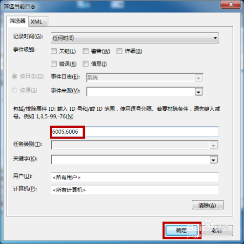 接下来我们就需要筛选出电脑的开机和关机时候了,具体的为6005和6006,输入后点击【确定】。