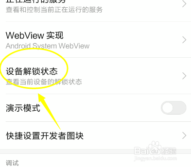 验证当作功我们回到手机找到设置开辟者选项---设备解锁状况点击。
