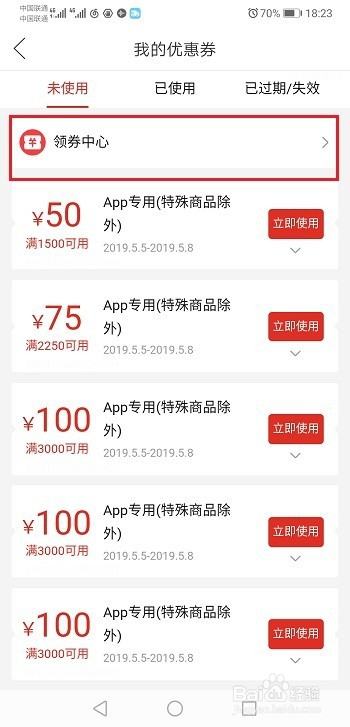 第三步进去优惠券界面,可以看到此刻已有的,点击领劵中间,如下图所示: