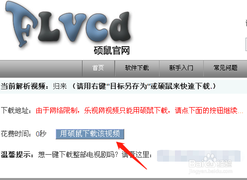 然后点击【用硕鼠下载该视频】按钮。在这里,有些视频还可以选择高清、超清等分歧画质下载,有的环境下视频还会分段下载,这个视频没有。