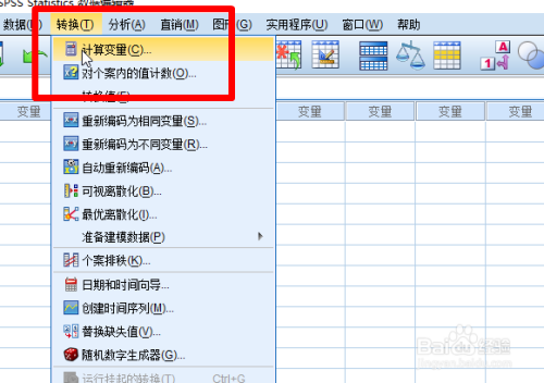 然后点击菜单栏中的【转换-计较变量】,打开计较变量对话框